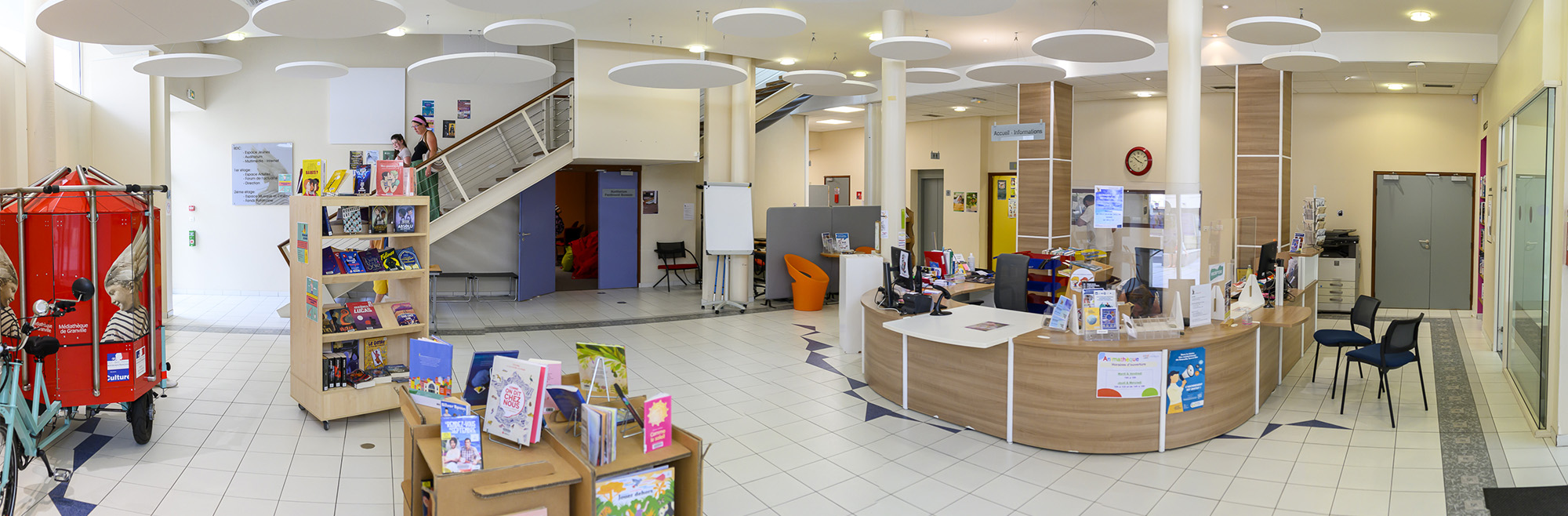 - Hall d’accueil et galerie d’exposition : Informations, inscriptions, retour des documents, consultation du catalogue, expositions culturelles.